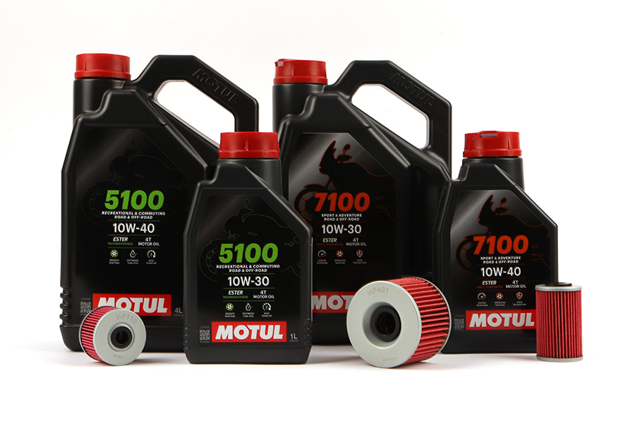Il kit comprende olio motore Motul specifico per moto nella gradazione corretta per il tuo veicolo, un filtro olio HifloFiltro compatibile, una nuova rondella e guarnizione per la coppa e un paio di guanti in lattice per eseguire il lavoro in modo sicuro e pulito direttamente a casa.